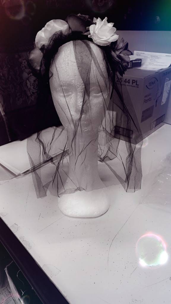Fehér virágos fekete tüllös fejdísz, fátyol hajráfon - Halloween - ÚJ
