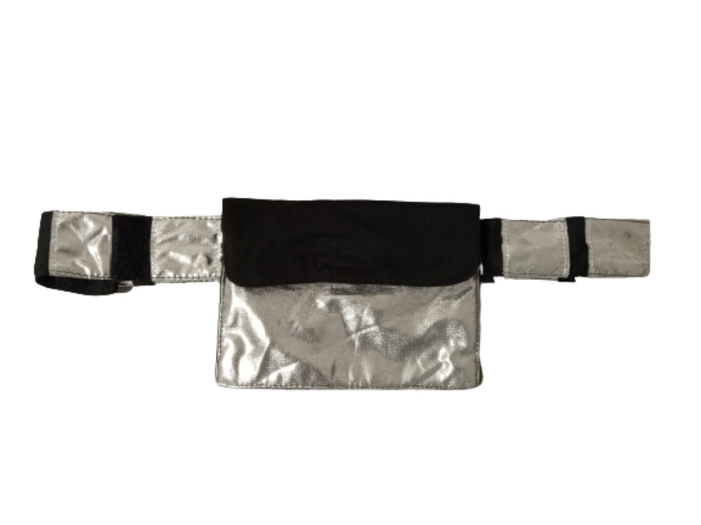 Fekete-ezüst jelmez öv, rajta kis táskával