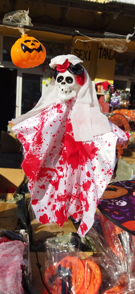 Kis méretű fehér-piros véres csontváz lepelben, dekoráció - Halloween - ÚJ