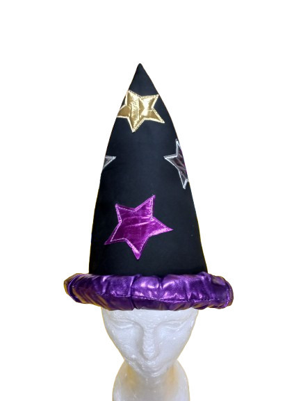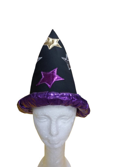 Nagyobb gyerekre fekete-lila csillagos varázslósapka, mágus sapka - ÚJ